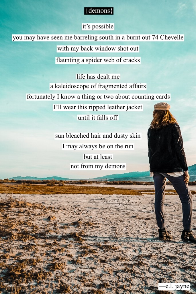 poetry {demons} Posted by E. L. Jayne on October 2, 2020October 13, 2020 Share this: Click to share on X (Opens in new window) X More Click to share on Facebook (Opens in new window) Facebook Click to share on WhatsApp (Opens in new window) WhatsApp Click to email a link to a friend (Opens in new window) Email Like Loading... Related