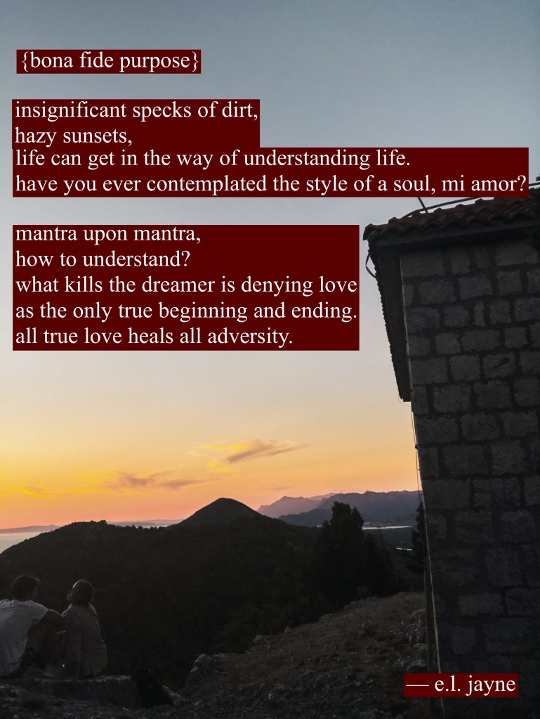 poetry {bona fide purpose} Posted by E. L. Jayne on October 11, 2020October 12, 2020 Share this: Click to share on X (Opens in new window) X More Click to share on Facebook (Opens in new window) Facebook Click to share on WhatsApp (Opens in new window) WhatsApp Click to email a link to a friend (Opens in new window) Email Like Loading... Related