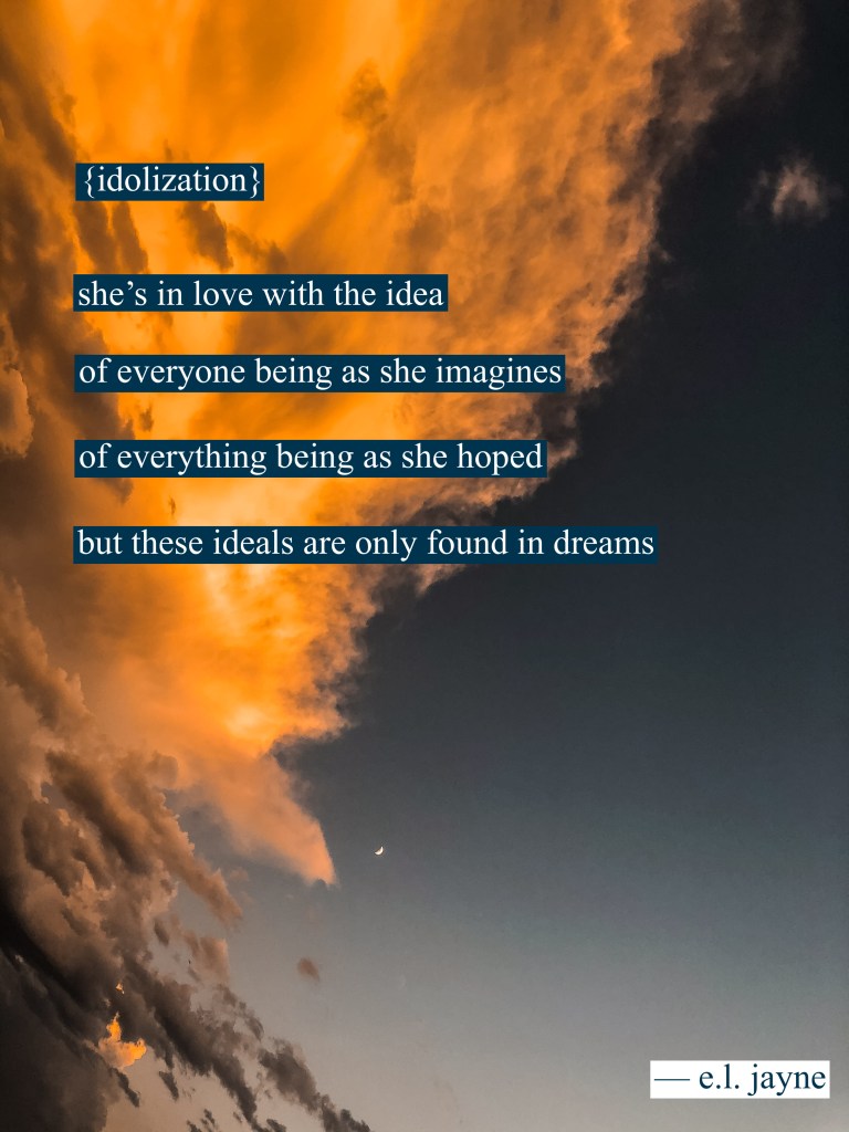 poetry {idolization} Posted by E. L. Jayne on October 11, 2020October 12, 2020 Share this: Click to share on X (Opens in new window) X More Click to share on Facebook (Opens in new window) Facebook Click to share on WhatsApp (Opens in new window) WhatsApp Click to email a link to a friend (Opens in new window) Email Like Loading... Related